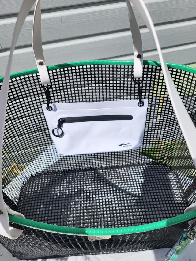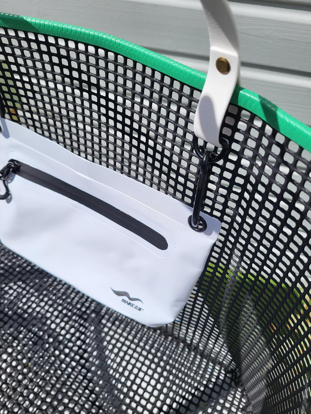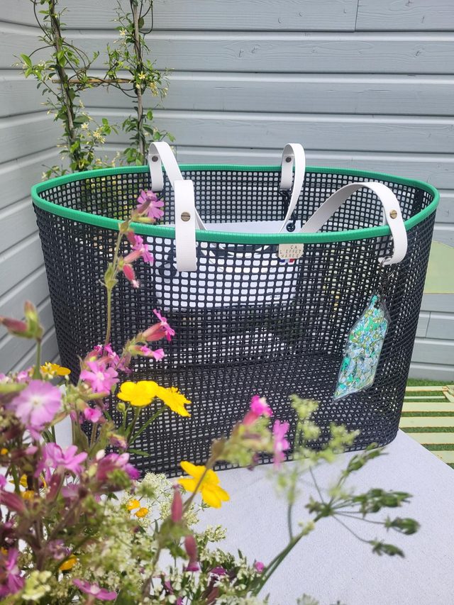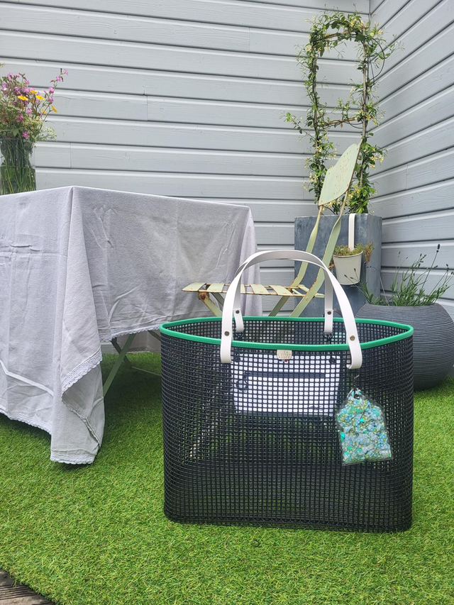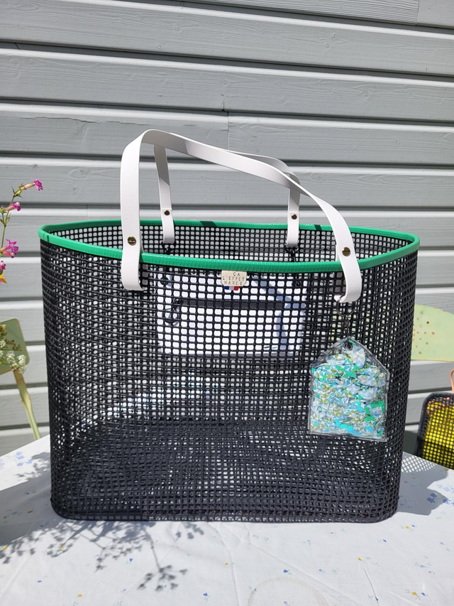 Avec son format XXL ce panier en maille ostréicole carrée est le compagnon idéal pour les sorties plage en famille ! Sa grande capacité de presque 48 litres permet de transporter tout le nécessaire pour profiter pleinement d'un moment agréable en bord de mer ou ailleurs (pique-nique, sac week-end.....) !! Il est accompagné d'une pochette étanche assortie qui s'attache facilement aux sangles du panier grâce à de jolis mousquetons noir en acier inoxydable.